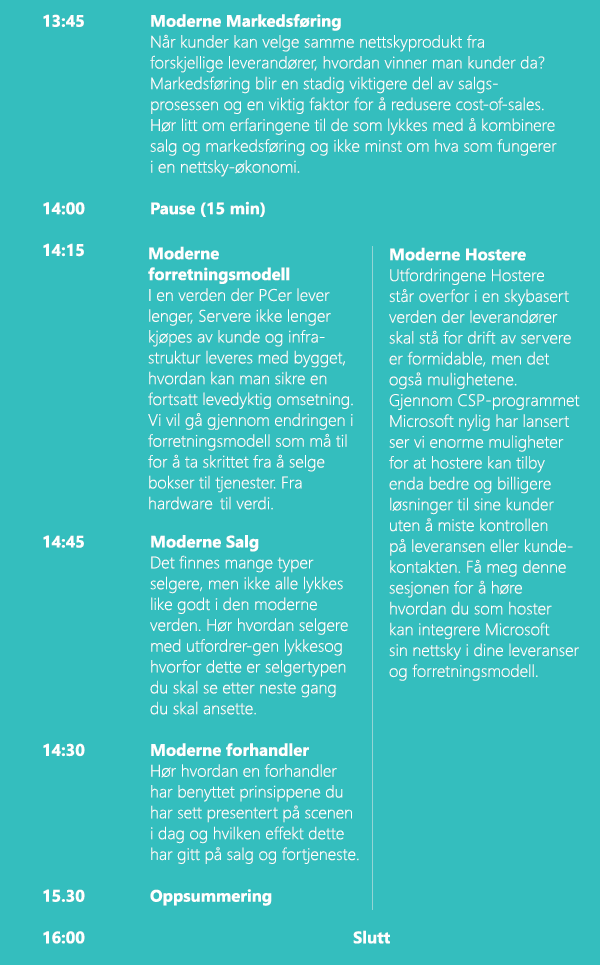 Som Microsoft-forhandler har du en av verdens aller største og mest fremgangsrike programvareleverandører i ryggen. Dette gir deg mange fordeler både på kompetanseheving, rabattmodeller og lisenser til eget bruk. Det er likevel viktig at du tar ansvar for å alltid ligge i forkant av utviklingen. Nye produkter, nye leveransemodeller og nye måter å drive business på gjør at du må være tilpasningsdyktig for å overleve morgendagen. For deg som hostingpartner har vi også samlet nyheter og fokusområder på en egen sesjon tilpasset deg. Sett av en dag til å utforske hva morgendagen bringer!